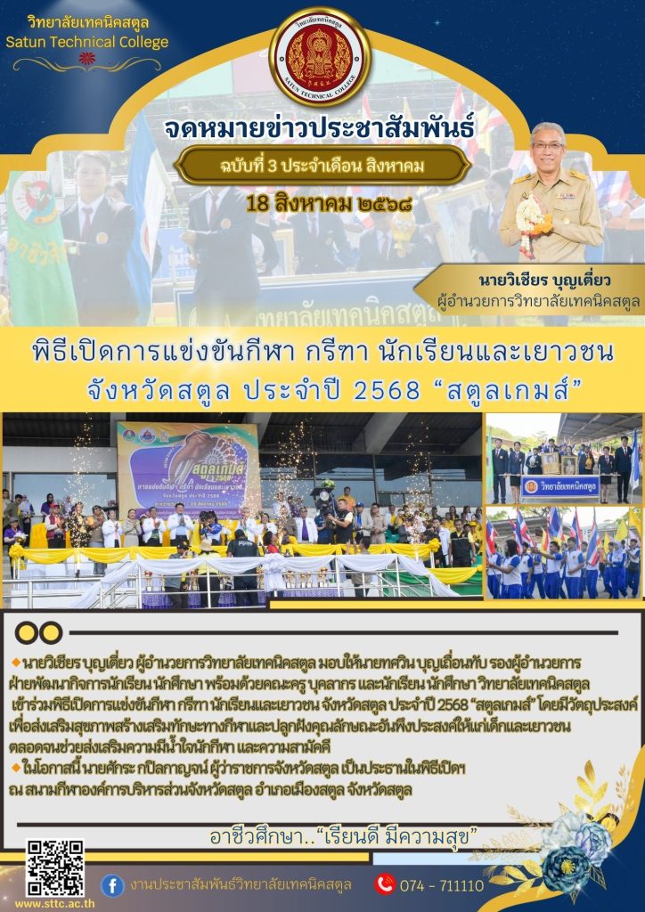 นายวิเชียร บุญเตี่ยว ผู้อำนวยการวิทยาลัยเทคนิคสตูล มอบให้นายทศวิน บุญเถื่อนทับ รองผู้อำนวยการฝ่ายพัฒนากิจการนักเรียน นักศึกษา พร้อมด้วยคณะครู บุคลากร และนักเรียน นักศึกษา วิทยาลัยเทคนิคสตูล เข้าร่วมพิธีเปิดการแข่งขันกีฬา กรีฑา นักเรียนและเยาวชน จังหวัดสตูล ประจำปี 2568 “สตูลเกมส์” โดยมีวัตถุประสงค์ เพื่อส่งเสริมสุขภาพสร้างเสริมทักษะทางกีฬาและปลูกฝังคุณลักษณะอันพึงประสงค์ให้แก่เด็กและเยาวชน ตลอดจนช่วยส่งเสริมความมีน้ำใจนักกีฬา และความสามัคคี