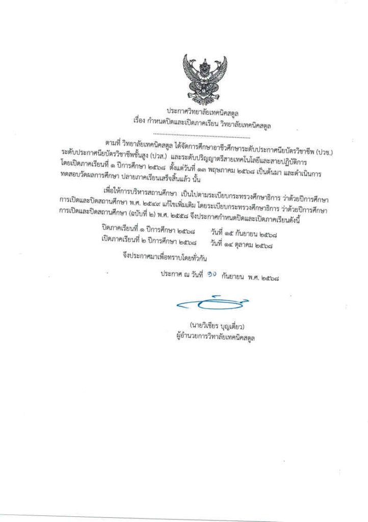 กำหนดปิดและเปิดภาคเรียน วิทยาลัยเทคนิคสตูล 10 ก.ย. 256815 ก.ย. 2025R-Cheevaประกาศ กำหนดปิดและเปิดภาคเรียน วิทยาลัยเทคนิคสตูล ดาวน์โหลดเอกสาร จำนวนผู้เข้าชม : 106