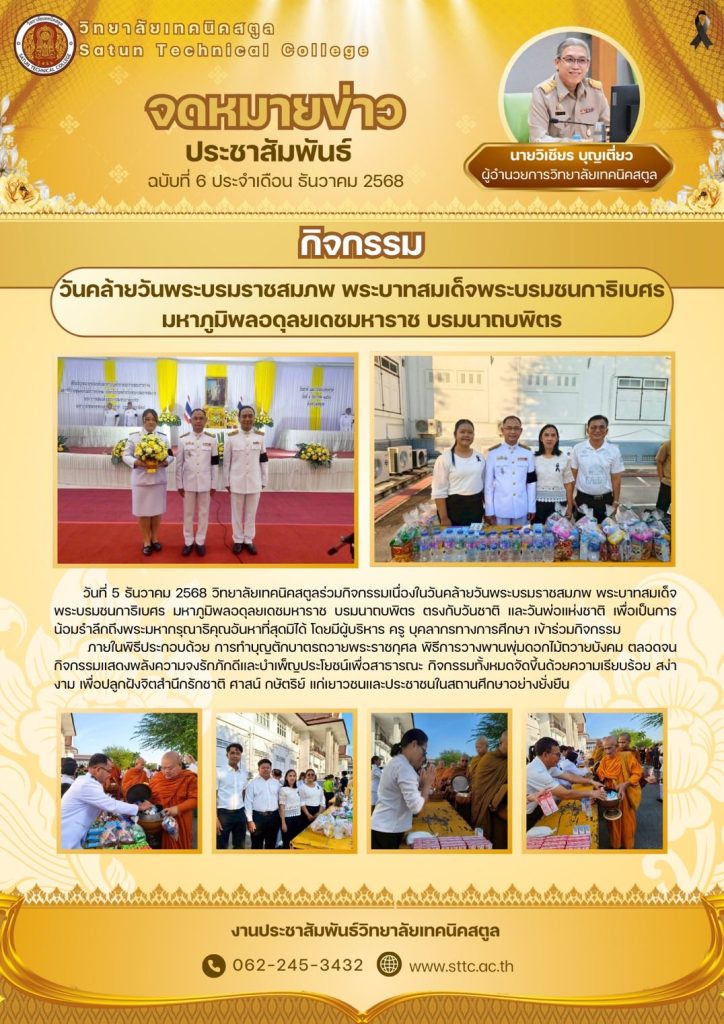 นายประมวล บุญช่วย รองผู้อำนวยการฯ พร้อมด้วยคณะครูและบุคลากรทางการศึกษาวิทยาลัยเทคนิคสตูล เข้าร่วมกิจกรรมเนื่องในวันคล้ายวันพระบรมราชสมภพพระบาทสมเด็จพระบรมชนกาทิเบศร มหาภูมิพลอดุลยเดชมหาราช บรมนาถบพิตร วันชาติและวันพ่อแห่งชาติ 5 ธันวาคม 2568