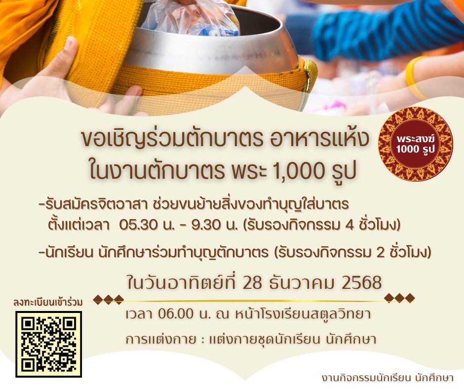 เนื่องด้วย คณะสงฆ์จังหวัดสตูลจัดงานตักบาตรพระ 1,000 รูป เพื่อถวายเป็นพระราชกุศลแด่ สมเด็จพระนางเจ้าสิริกิต์ พระบรมราชินีนาถ พระบรมราชชนนีพันปีหลวง ณ บริเวณหน้าโรงเรียนสตูลวิทยา ในวันอาทิตย์ที่ 28 ธันวาคม 2568 เวลา 06.00 น. จึงขอเชิญผู้บริหารและบุคลากร นักเรียน นักศึกษาทุกท่าน ร่วมตักบาตรอาหารแห้ง โดยนักเรียน นักศึกษาที่เข้าร่วมอ่านรายละเอียดด้านล่างนี้ หรือลงทะเบียนเข้าร่วมผ่านลิงค์ https://forms.gle/fRKLuPWVgbJsNqAC9