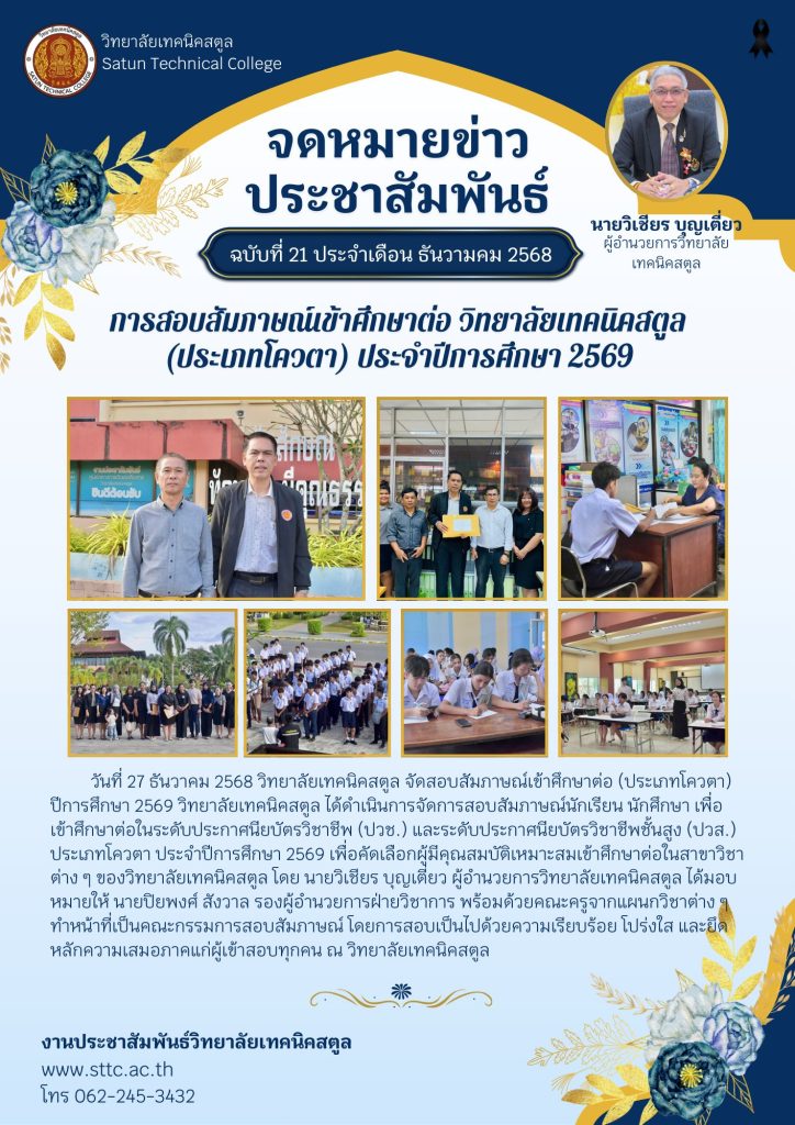 วิทยาลัยเทคนิคสตูล ได้ดำเนินการจัดการสอบสัมภาษณ์นักเรียน นักศึกษา เพื่อเข้าศึกษาต่อในระดับประกาศนียบัตรวิชาชีพ (ปวช.) และระดับประกาศนียบัตรวิชาชีพชั้นสูง (ปวส.) ประเภทโควตา ประจำปีการศึกษา 2569 เพื่อคัดเลือกผู้มีคุณสมบัติเหมาะสมเข้าศึกษาต่อในสาขาวิชาต่าง ๆ ของวิทยาลัยเทคนิคสตูล