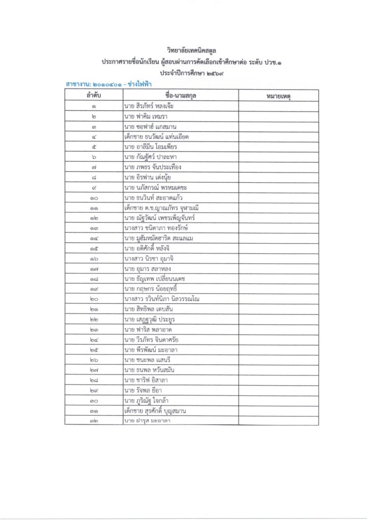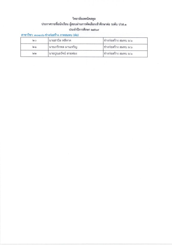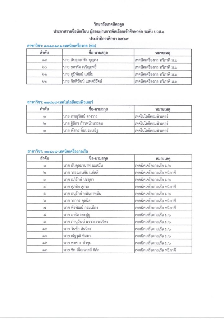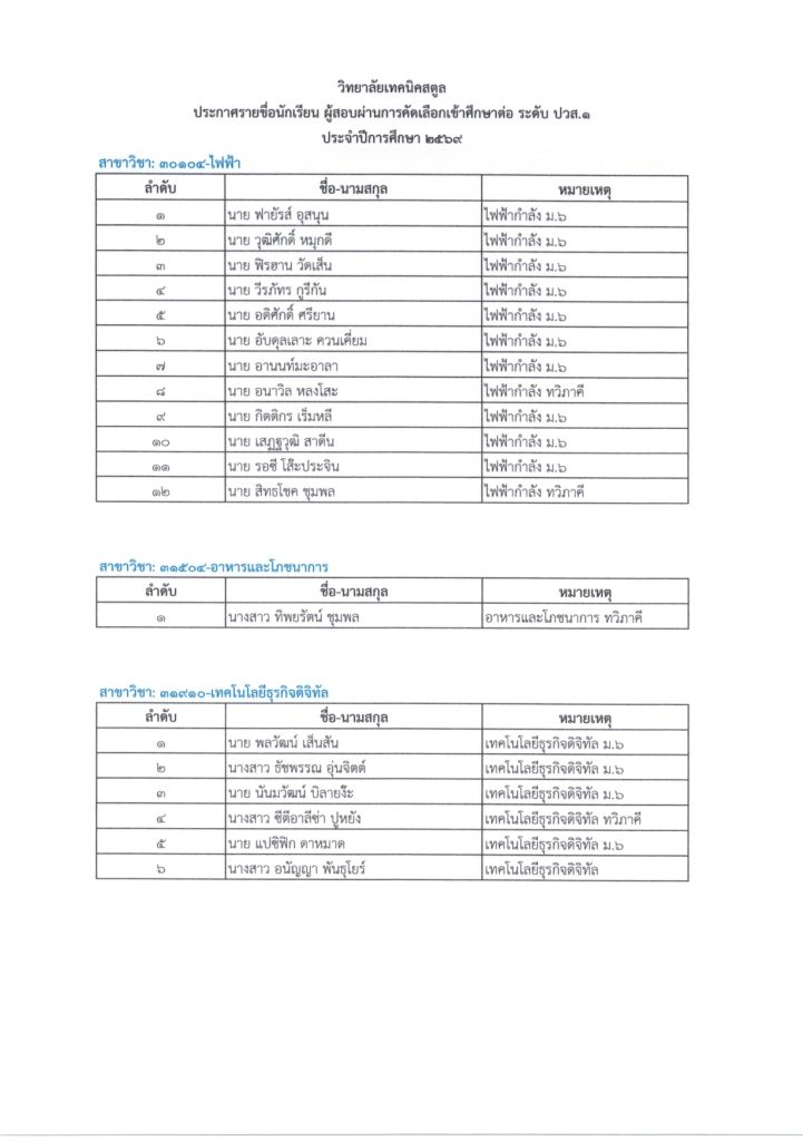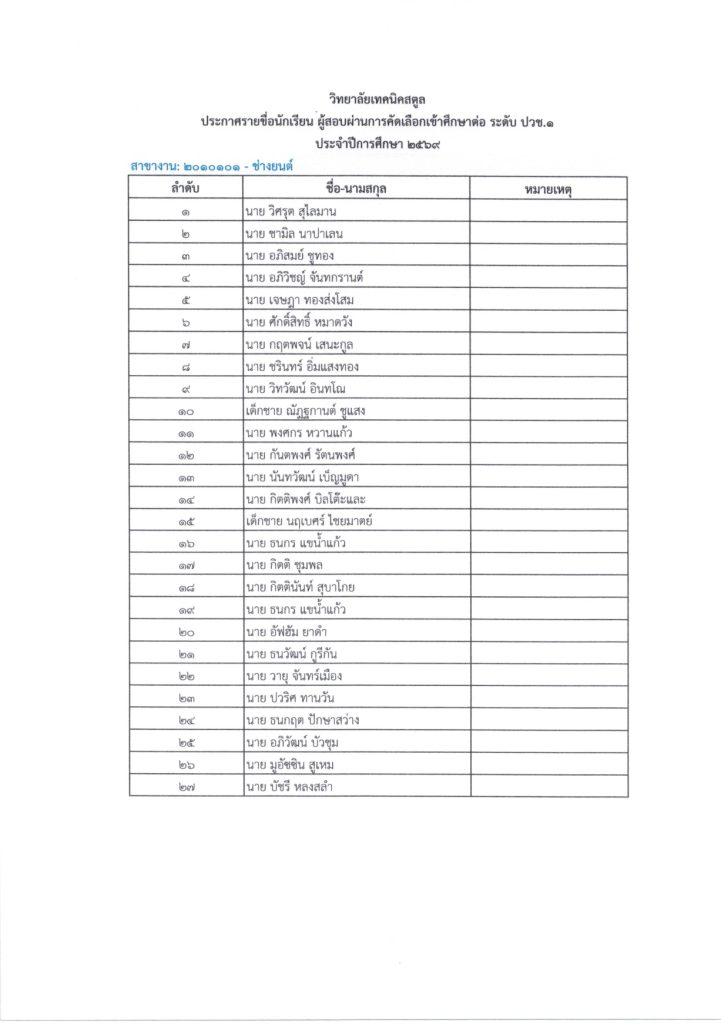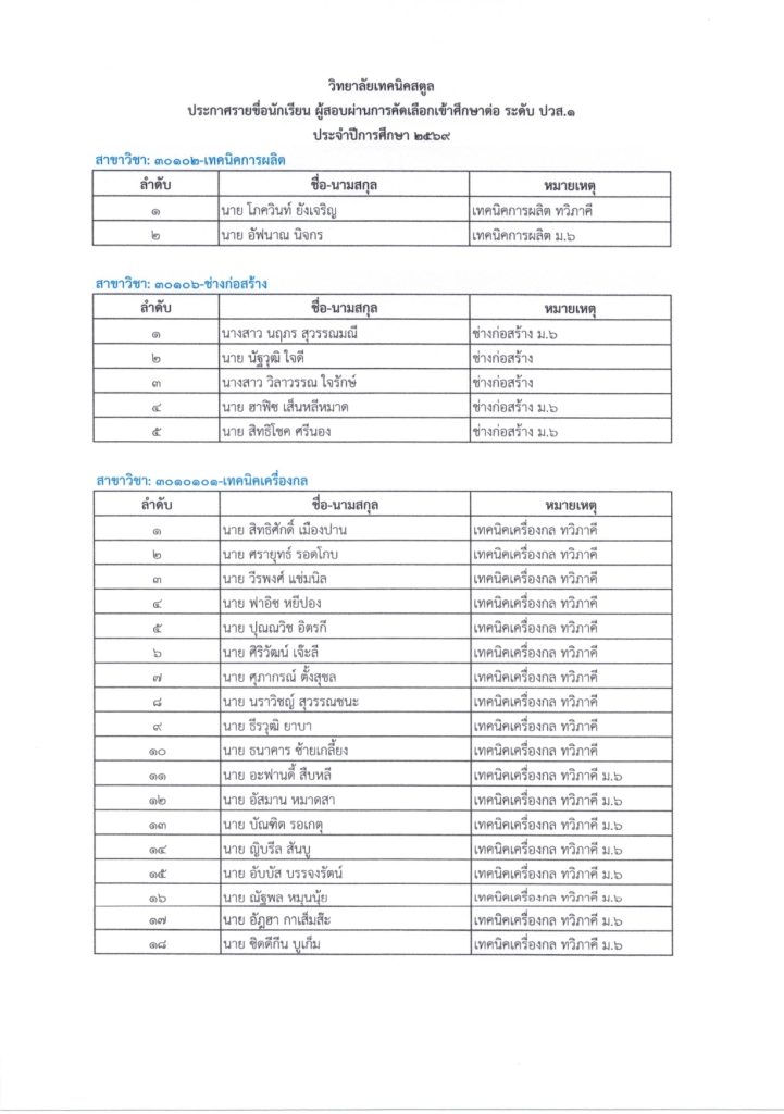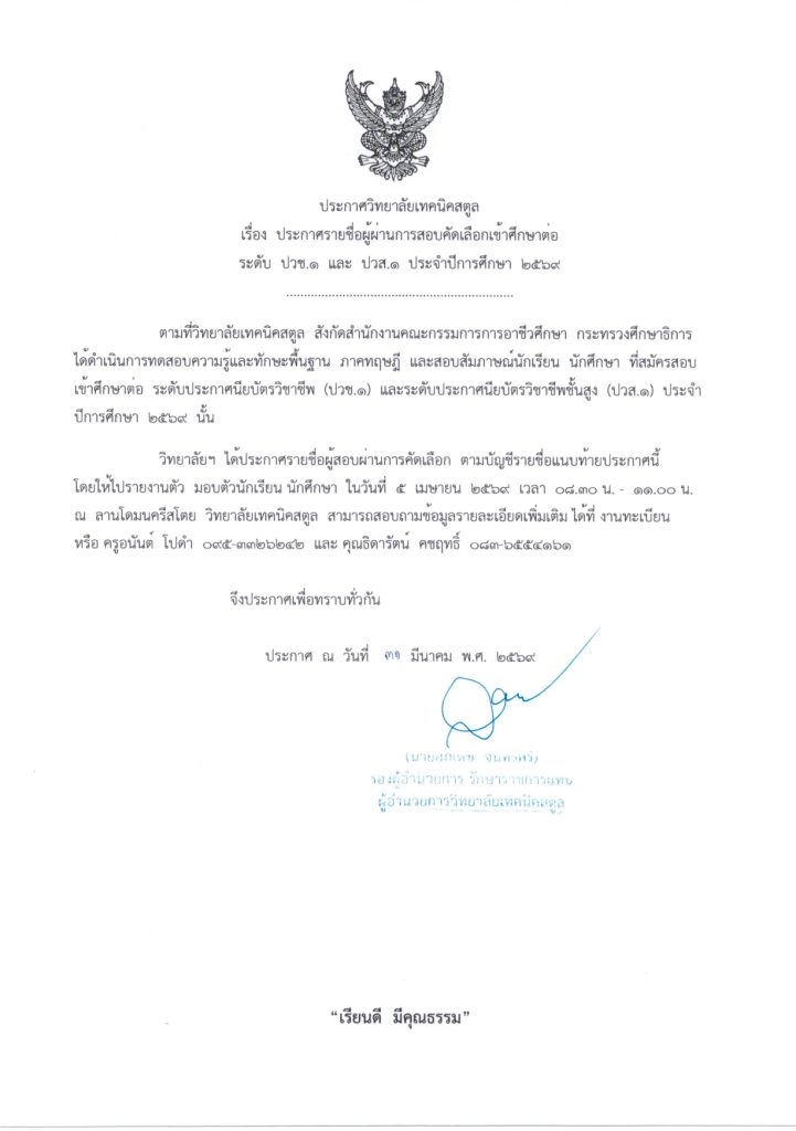 ประกาศรายชื่อผู้ผ่านการคัดเลือกเข้าศึกษาต่อ วิทยาลัยเทคนิคสตูล ประจำปีการศึกษา 2569