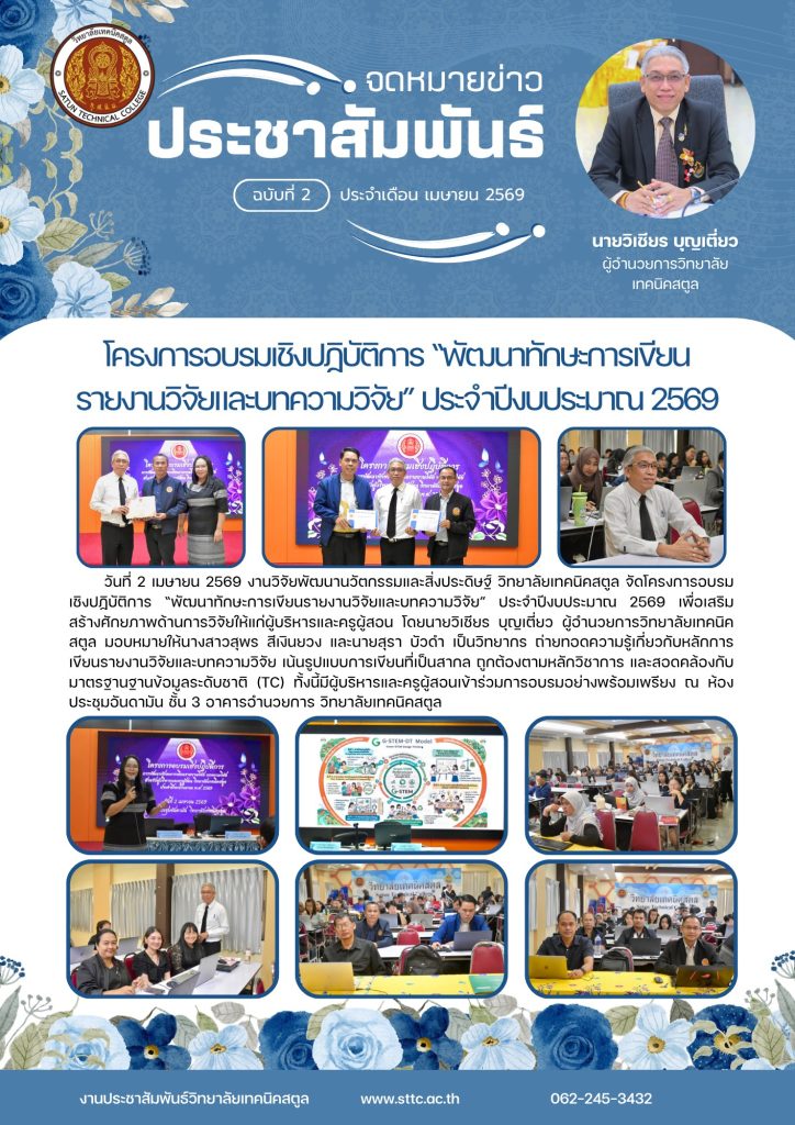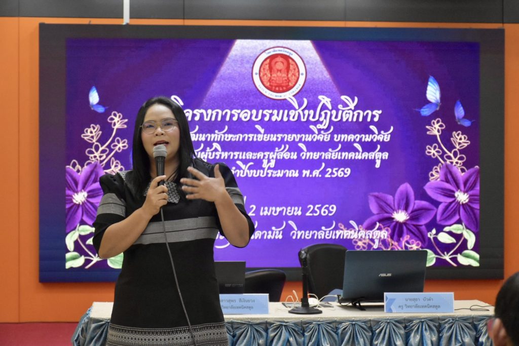 วันที่ 2 เมษายน 2569 งานวิจัยพัฒนานวัตกรรมและสิ่งประดิษฐ์ วิทยาลัยเทคนิคสตูล จัดโครงการอบรมเชิงปฏิบัติการ “พัฒนาทักษะการเขียนรายงานวิจัยและบทความวิจัย” ประจำปีงบประมาณ 2569 เพื่อเสริมสร้างศักยภาพด้านการวิจัยให้แก่ผู้บริหารและครูผู้สอน